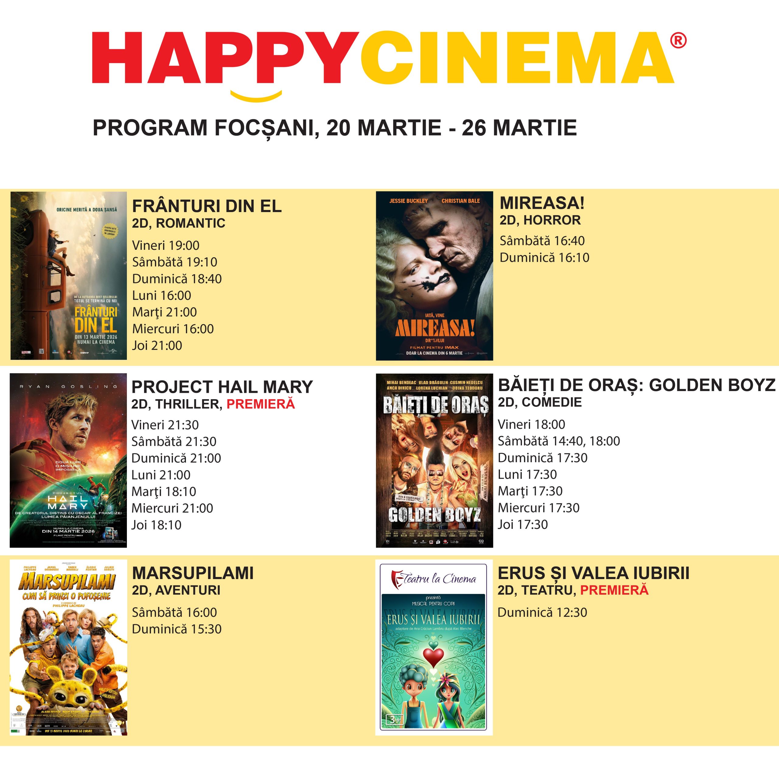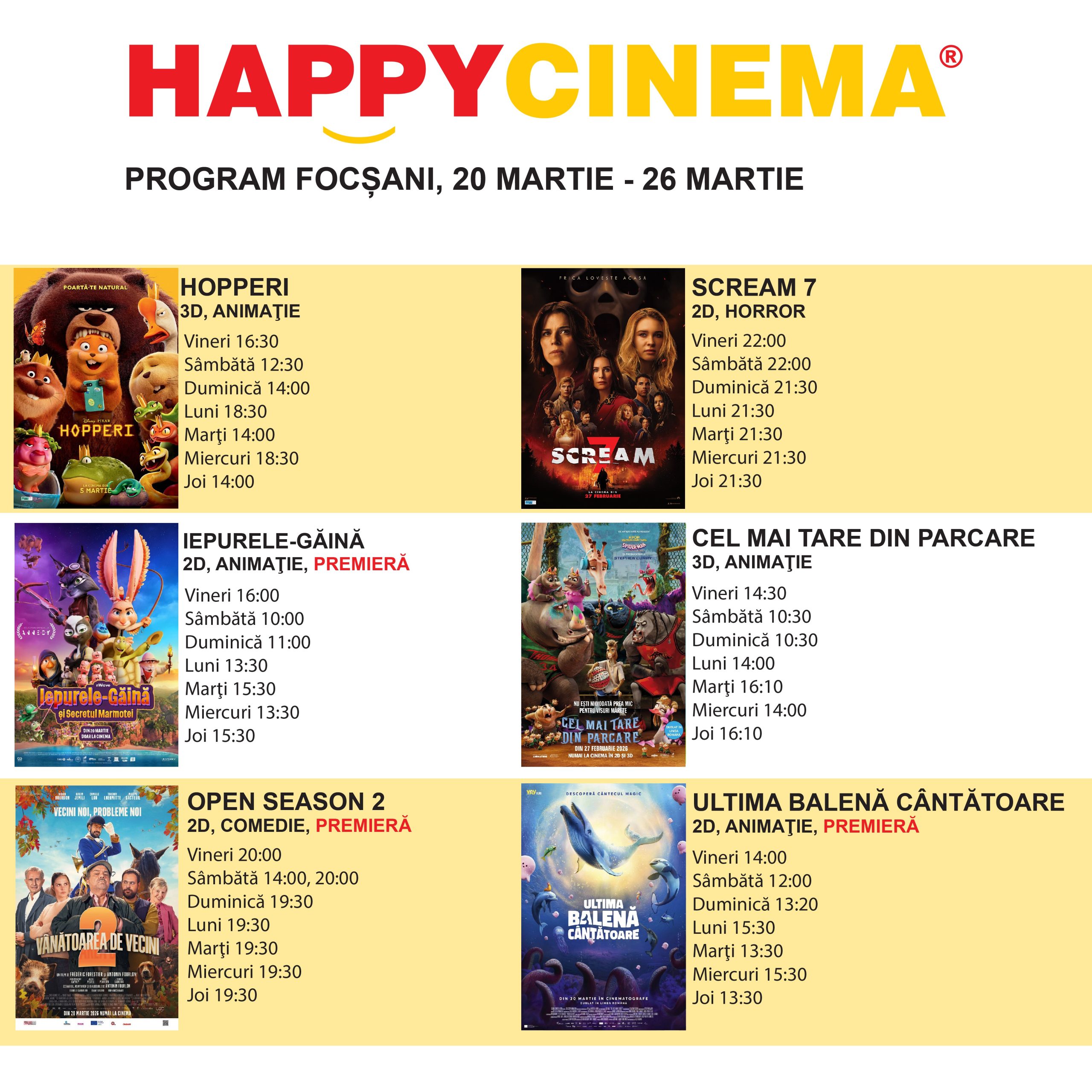 Vă prezentăm programul celui mai modern cinematograf din județul Vrancea! Astfel ca va invitam la Happy Cinema Focsani, la Promenada Mall, pe soseaua de centura a municipiului Focsani!